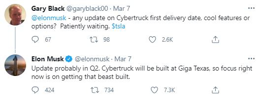 7일(현지시간) 머스크는 트위터 상에서 사이버트럭의 출시 예정일과 관련 내용을 묻는 질문에 “아마도 2분기에 최신 내용을 공지할 것”이라며 “사이버트럭은 텍사스 기가팩토리에서 생산할 예정이며 현재 이에 초점을 맞추고 있다”고 답했다.