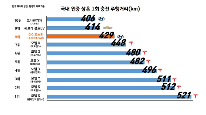 국내 인증 된 모델 중 ‘1회 충전시 주행 거리’ 상위 7위까지는 모두 테슬라가 독식 중이다. 아이오닉5는 테슬라 모델 X 퍼포먼스 트림(448km)에 이어 8위를 차지했다. 쉐보레 볼트 EV(414km)와 코나 전기차(406km)는 각각 9위와 10위로 밀려났다.