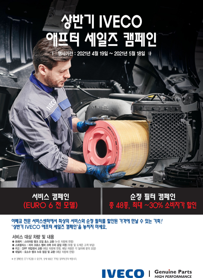 이번 캠페인에서는 대형상용차 스트랄리스와 트래커, 중형상용차 유로카고, 소형상용차 데일리 등 유로6 전 차종을 대상으로 총 48종의 순정 필터류를 최대 30%할인하며 차량점검 등 다양한 서비스를 제공한다.