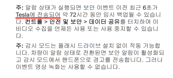이 카메라는 오토파일럿에도 활용하지만 주차시 사람이 접근하면 영상이나 사진을 촬영해 기록하고 이용자의 스마트폰으로 알람을 전하는 기능도 갖고 있다. 또, 사고 등 특별한 이벤트가 발생하면 서버로 전송하는 기능도 갖고 있다.