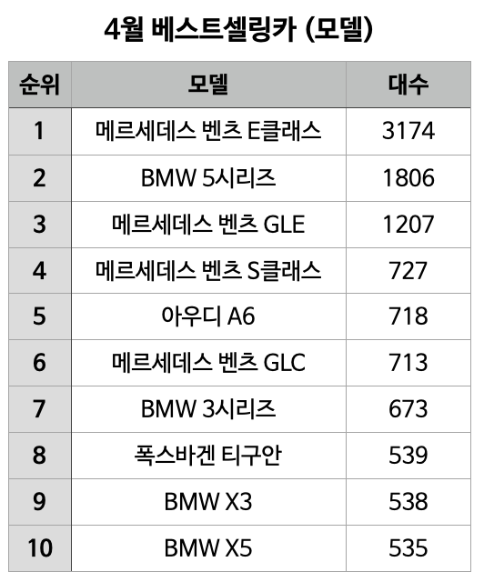 모델별로 살펴보면 메르세데스-벤츠 E클래스(3174대), BMW 5시리즈(1806대), 메르세데스-벤츠 GLE(1207대), 메르세데스-벤츠 S클래스(727대) 등 순으로 나타났다.