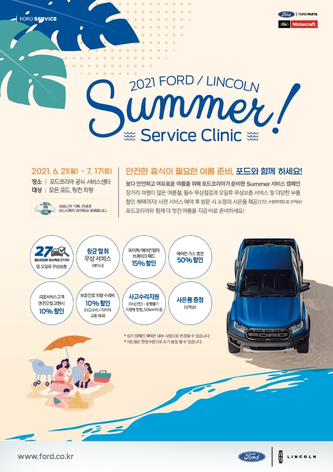 포드코리아도 다음 달 17일까지 전국 포드·링컨 서비스센터에서 ‘서머 서비스 클리닉(Summer Service Clinic)’ 캠페인을 실시한다. 포드와 링컨 전 차종을 대상으로 27가지 멀티포인트 무상점검과 각종 오일류 무상 보충 서비스를 제공하며 와이퍼, 에어컨 필터, 브레이크 패드 15%할인 및 에어컨 가스 충전 50% 할인, 보증만료 차량 수리비 10% 할인 등 다양한 혜택을 제공한다. 또 사고수리 차량에 대해서는 무상 견인 서비스를 제공한다.