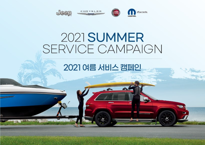 지프는 전국 지프 공식 서비스 센터에서 다음 달 31일까지 약 6주간 ‘2021 여름 서비스 캠페인(2021 Summer Service Campaign)’을 실시한다. 먼저 지프, 크라이슬러, 피아트 전 차종을 대상으로 차량 무상점검 서비스를 제공한다.
