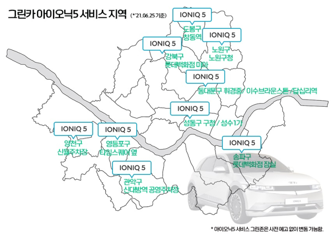 [오토캐스트=강명길기자] 그린카가 카쉐어링 업계 최초로 아이오닉5 익스클루시브 트림 서비스를 시작한다고 25일 밝혔다. 이번 아이오닉5 서비스는 이용률이 가장 높은 서울의 12개 그린존에서 시작한다.