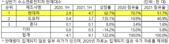 올 상반기 세계 각국에 등록된 수소연료전지차의 총 판매대수는 9000대를 넘어섰다. 이는 전년 동기 대비 2.2배 이상 성장한 수치다. 올해 1월 출시된 현대차 넥쏘 2021년형 모델의 판매량이 올 2분기 들어 전년 동기 대비 91.1% 급증한 것이 결정적으로 작용했다. 토요타는 미라이 2세대 신모델을 앞세워 판매량이 작년 상반기 대비 8.3배 이상 성장한 3700대를 판매했다.