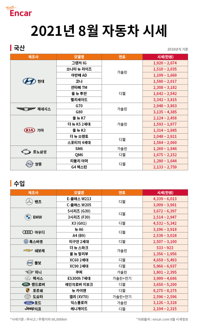 3일 엔카닷컴이 공개한 8월 중고차 시세에 따르면 올해 국산차 및 수입차 전체 중고차 시세는 평균 0.37% 하락해 보합세를 유지했다. 이번에 공개된 중고차 시세는 현대자동차, 기아자동차, 르노삼성, 쌍용 등 국내 완성차 브랜드와 벤츠, BMW, 아우디 등 수입차 브랜드의 2018년식 인기 차종 중고차 시세다.