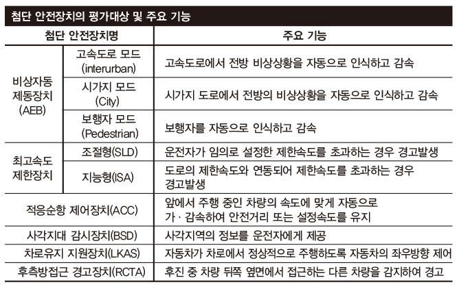 ADAS는 운전자 보조 시스템으로 전방 차량 추돌 경고, 차선 이탈 방지 보조, 비상자동제동장치, 하이빔 스마트 컨트롤 시스템 등 능동형 차량 제어 기능을 포함한다. 국내에서는 지난 2013년 국토부가 전방 충돌 경고 장치를 자동차 안전도 평가에 도입한 이후 2017년 9가지 첨단 안전장치를 평가 대상에 포함하는 등 ADAS 장착을 장려하고 있다.