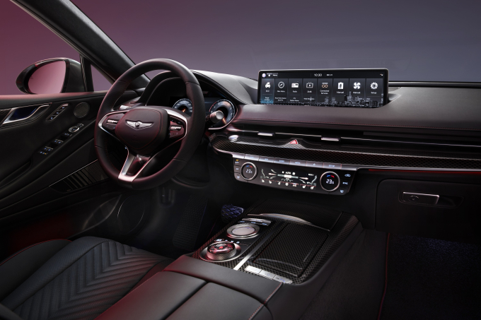 실내엔 G80 스포츠 패키지 전용 3 스포크 스티어링 휠, 하이브리드 위빙/리얼 카본 가니쉬, 메탈 소재 페달을 새롭게 적용했다. 이와 함께 G80 스포츠 패키지에서만 선택 가능한 전용 내장 색상 옵시디언 블랙/세비야 레드 투톤을 추가해 스포티함을 더했다.