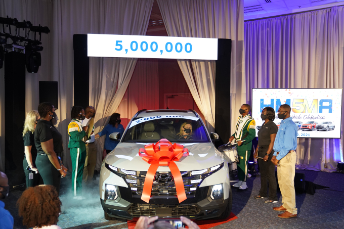 이날 현대차는 자축하는 의미로 공장 내 트레이닝 센터에서 500만 번째 차인 싼타크루즈를 모터쇼 형태로 공개하고 퍼레이드를 진행했다. 특히 퍼레이드에는 미국 공장에서 최초로 생산한 NF 쏘나타와 함께 현재 생산하고 있는 모든 차 라인업이 나섰으며, 미국 공장 창립멤버와 지역 고교 악단이 참석해 그 의미를 더했다.