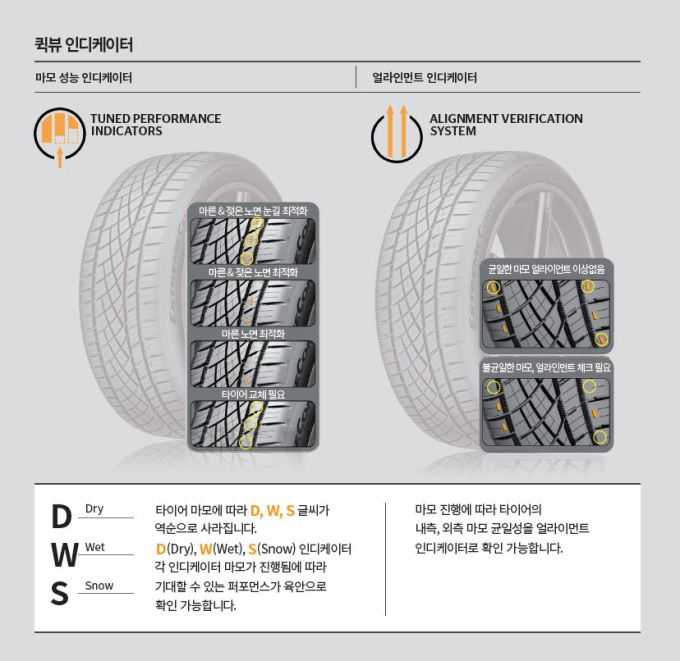 퀵뷰 인디케이터(Quick-view Indicator) 기능도 적용했다. 트레드에 위치한 인디케이터를 통해 퍼포먼스 레벨 성능을 육안으로 파악할 수 있다. 제품명의 DWS는 각각 ‘Dry’, ‘Wet’, ‘Snow’를 의미하며, 타이어가 마모될수록 트레드에 표시된 DWS문자(마모 성능 인디케이터) 가 S->W->D 순으로 사라진다. S가 사라지면 ‘눈길(Snow) 성능 한계 도달’, W가 사라지면 ‘빗길 노면(Wet) 성능 한계 도달’, D가 사라지면 ‘마른 노면(Dry) 성능 한계 도달’을 의미한다.