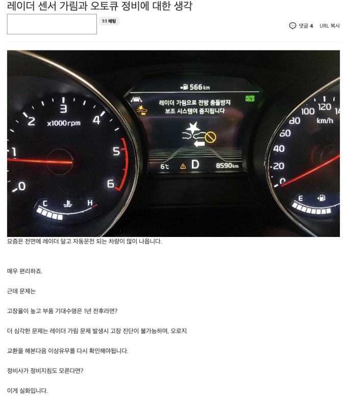 이에 대해 한 기아 차량 운전자는 “차를 구입하면서 안전을 위한 사양이라고 설명해 비싼 옵션이지만 ADAS를 선택했다”며 “그런데도 ADAS의 기본 부품인 레이더 센서 고장은 일반적인 정비가 아니라서 그런지 아무 오토큐에서나 받아주지 않는다. 기아 콜센터를 통해 수리가 가능한 사업소를 안내 받아 방문해야 하는데 예약도 한참이다”라며 불편함을 호소했다.