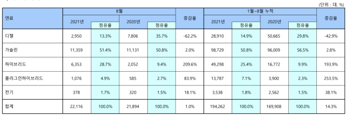 한편 KAIDA가 집계한 8월 수입 승용차 신규등록대수는 2만2116대다. 이는 지난해 같은 기간보다 1.0% 증가하고, 전달보다 9.3% 감소한 수치다. 이에 대해 KAIDA 임한규 부회장은 “8월 수입 승용차 신규등록은 일부 브랜드의 반도체 수급 난에 따른 공급부족과 물량부족 등으로 전월 대비 감소했다”라고 설명했다.