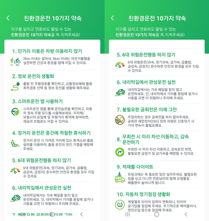 운전자가 해당 앱을 설치 후 차종 크기, 유종, 연식, 현재주행 거리 등의 차량 정보를 입력하면 메인 화면에서 ‘친환경 운전 10가지 약속’을 확인할 수 있다. 차량 주행 시 앱을 실행하면 자동으로 스마트운전 데이터가 축적되며 운전자는 100점 만점에서 과속, 급가속, 급감속, 공회전 등의 횟수를 바탕으로 스마트운전 종합지수 및 순위를 직접 확인할 수 있다. 맵퍼스는 이를 통해 미세먼지 절감과 온실가스 감축 등 친환경 운전 문화 확산에 기여한다는 전망이다.