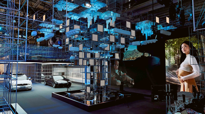 현대차가 모셔널과 공동 개발한 아이오닉 5 로보택시를 일반에 처음 공개했다. 전시관 중앙에는 친환경 수소 생성부터 저장, 운반, 사용까지 수소의 전체 가치사슬을 예술적으로 표현한 ‘수소사회 조형물(Hydrogen Society Centerpiece)’을 설치했다.