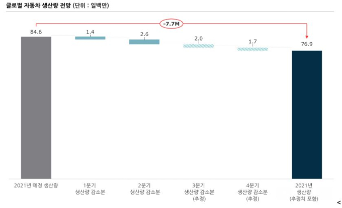 알릭스파트너스는 지난 1월 당시 약 71조원(610억 달러) 규모의 매출 손실액을 제시한 데 이어 5월에는 약 124조원(1100달러)로 상향 조정했다. 이번 수치는 이전보다 약 123조원 늘어난 추정치이다. 또 전 세계 자동차 생산량 감소 역시 770만대에 이를 것이라고 전망했다. 이는 앞서 5월에 발표한 390만 대 보다 약 두 배에 달하는 수준이다.