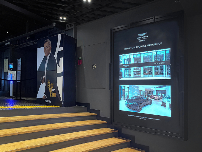 애스턴마틴 서울은 CGV 압구정, 연남, 메가박스 센트럴 등 총 3개 지점에 영화 속 본드카를 중심으로 애스턴마틴의 전통을 다양한 비주얼 작품으로 전달한다. 작품의 소재는 본드카로 활약한 애스턴마틴 모델로 스크린 광고를 포함해 극장 입구, 키오스크 등 극장 곳곳에 다양한 포스터와 브랜딩 작품을 전시한다.