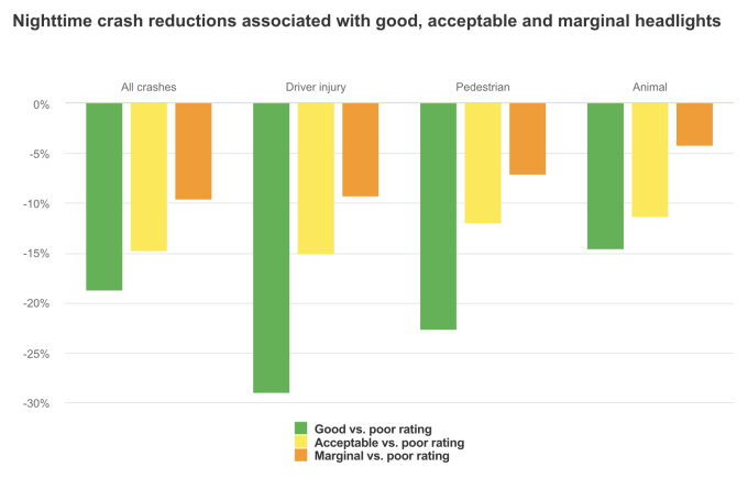 IIHS에 따르면 야간에 발생한 4만4000건의 차량 충돌 사고를 분석한 결과 ‘우수(good)’을 받은 헤드라이트가 ‘불량(poor)’을 받은 헤드라이트보다 1마일당 밤 시간대 사고 발생률이 20% 낮았다. ‘양호(acceptable)’를 받았을 경우 ‘불량(poor)’을 받았을 때보다 해당 비율이 15%, ‘보통(marginal)’ 을 받은 차량이 10% 낮아지는 것으로 나타났다. 또 ‘우수(good)’ 평가를 받은 헤드라이트의 경우 ‘불량(poor)’ 등급을 받은 헤드라이트에 비해 운전자 부상 확률과 보행자 충돌 비율이 각각 약 30%, 보행자 충돌 비율이 25% 낮은 것으로 나타났다.
