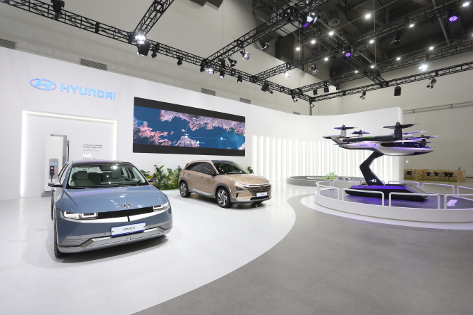 현대차는 미래 도심항공 모빌리티인 UAM 1:3 축소형 모델을 전시하고 대표 친환경차인 아이오닉5 롱레인지 후륜구동 모델, 수소전기차 넥쏘 등으로 공간을 구성했다. 또 초고속 충전 시스템 E-Pit 모형을 선보이고 어린이들이 수소전기차를 체험할 수 있는 넥쏘 키즈카 존도 운영한다.