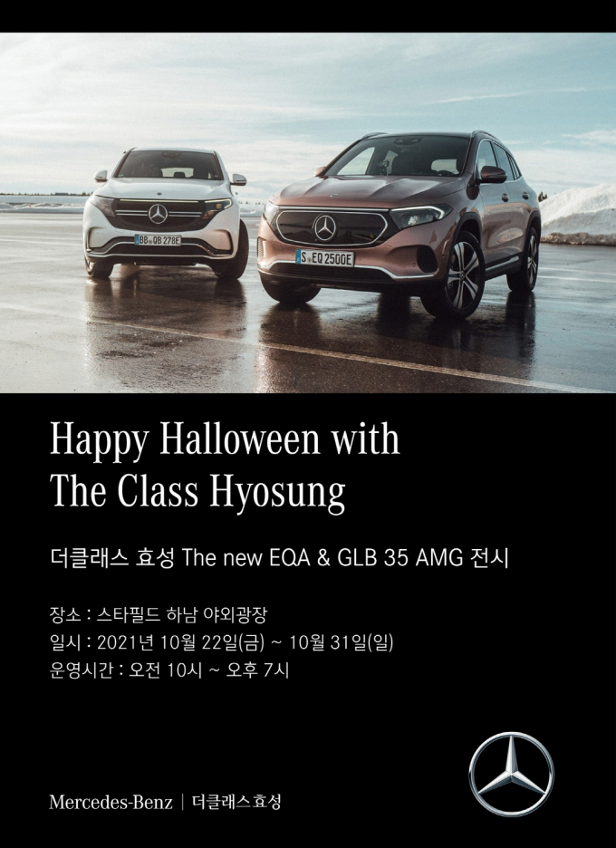 더클래스 효성은 메르세데스-EQ의 전기 SUV ‘더 뉴 EQA’와 스포츠 퍼포먼스 패밀리 SUV ‘더 뉴 메르세데스-AMG GLB 35 4MATIC’을 전시하며 현장 방문객을 대상으로 상담과 시승 기회를 제공한다. 아울러 할로윈 시즌을 맞아 화려한 전시 디스플레이를 선보이고 행사장 방문 고객을 대상으로 디지털 룰렛 이벤트를 통해 사은품을 증정한다. 또 행사장에서는 다양한 메르세데스-벤츠 컬렉션 상품도 만나볼 수 있다.