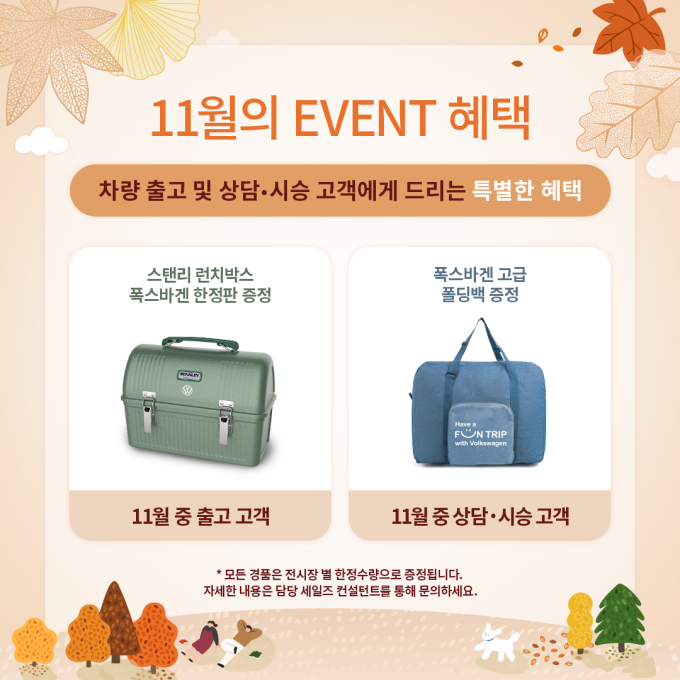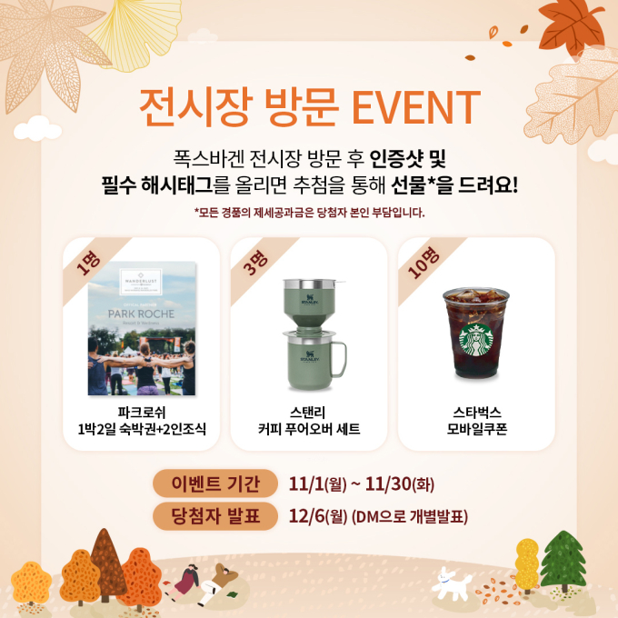 폭스바겐 전시장 방문 인증샷 이벤트도 진행한다. 11월 중 공식 인스타그램 팔로우 후 이벤트 지정 해시태그와 함께 전시장 방문 인증샷 게시글을 업로드하면 추첨을 통해 1등은 파크로쉬 1박 숙박권(1명), 2등은 스탠리 커피 푸어오버 세트(3명), 3등에게는 스타벅스 모바일 커피 쿠폰(10명)을 경품으로 증정한다. 당첨자 발표는 12월 6일 폭스바겐코리아 공식 네이버 포스트를 통해 공지한다.
