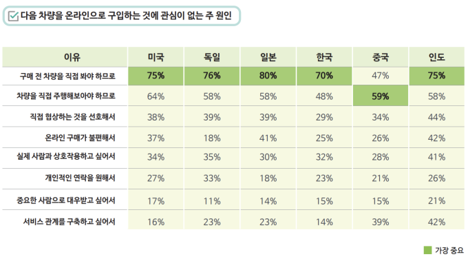 한국 딜로이트 그룹의 ‘2021 글로벌 자동차 소비자 조사 보고서’에 따르면 차량 구입 시 가장 선호하는 구매 방법은 우리나라 소비자들의 67%가 대면, 12%가 일부 비대면, 21%가 비대면 방식인 것으로 나타났다. 이 가운데 온라인 구입을 꺼리는 주된 요인은 ‘구매 전 차량을 직접 봐야하기 때문’인 것으로 나타났다.