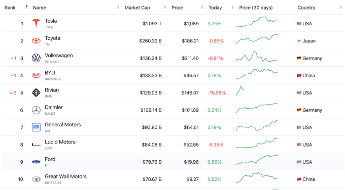 한편 글로벌 자동차 시가총액 10위권에 자리한 전기차 업체만 테슬라, BYD, 리비안, 루시드 등 4곳이다. 20위권에는 중국 전기차 업체 니오, 샤오펑, 리오토까지 진입해 있다. 이 밖에 오는 LA오토쇼에서 전기 크로스오버 오션 공개를 앞둔 '피스커', 내년 양산을 목표로 배송용 전기 밴을 개발 중인 '카누' 등도 각각 37위, 41위에 자리하고 있다.