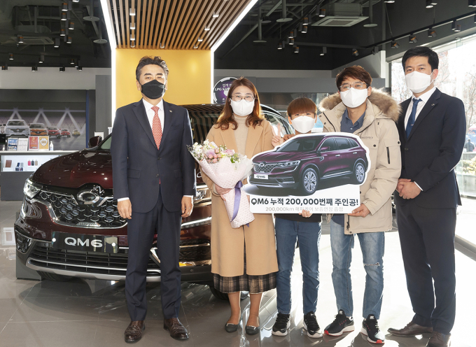 1일 경기도 성남 르노삼성자동차 분당오리지점에서 열린 ‘QM6 20만 번째 출고 고객 기념식’은 11월 중순 QM6를 구매해 주인공으로 선정된 분당에 거주하는 40대 중반 여성 고객인 김수경씨와 가족이 참석한 가운데 진행했다. 이번 기념식에서 르노삼성자동차는 ‘20만㎞ 보증 연장 교환권’을 김씨에게 선물했다.