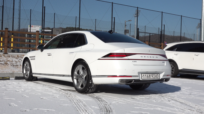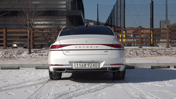 뒷모습 역시 제네시스 디자인의 핵심 요소인 두줄 리어램프가 들어간다. 이전과 다른 게 있다면 리어램프가 트렁크에 따라 길게 이어졌다는 점이다. 그리고 이 사이에 제네시스 레터링 엠블럼을 집어넣었다. 사실 G90이 처음 나왔을 때 가장 아쉬웠던 게 바로 이 레터링 엠블럼의 서체였다. 보기 싫어서 그런 건 아니고 브랜드 고유 서체와는 달라서였다. 프리미엄 브랜드의 기함은 하나부터 열까지 모두 세세하게 관리해 브랜드 이미지를 통합적으로 만들어야 한다. 그런데 가장 기본인 브랜드 이름 서체를 옆으로 길게 늘려 넣었다. 다른 모델에도 동일한 서체 엠블럼이 들어갔지만 여전히 납득하기가 어렵다.
