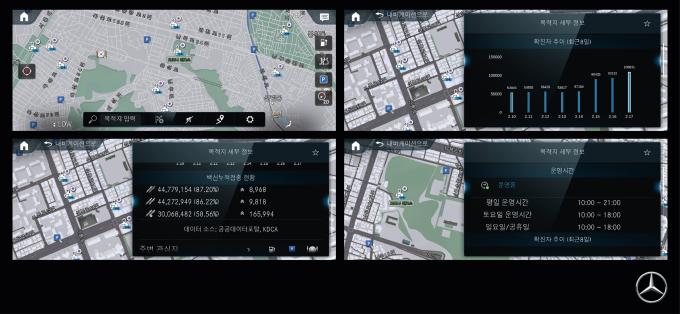 MBUX 내비게이션이 탑재된 모든 메르세데스-벤츠 차량에서 별도 업데이트 없이 무료로 신속항원검사 가능 의료기관 정보를 확인할 수 있으며 운전자는 내비게이션의 지도표시 메뉴를 선택해 ‘COVID-19’ 항목을 활성화 하면 사용 가능하다.