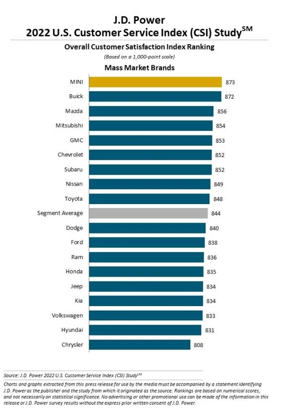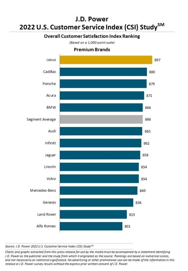 미국의 시장조사업체 JD 파워는 지난 2019년부터 2021년까지 신차 구매 후 3년 이내에 대리점에서 유지 보수 및 수리 서비스를 받은 고객의 만족도를 서비스 개시, 차량 픽업, 서비스 시설, 서비스 품질, 서비스 어드바이저 등 5가지 측면에서 조사했다.