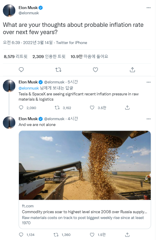 이어 "우리는 혼자가 아니다"라는 트윗과 함께 파이넨셜 타임즈(Financial Times)의 기사를 공유했다. 파이넨셜 타임즈는 원자재 가격이 러시아 공습으로 인해 2008년 이후 가장 높은 수준으로 치솟았다고 보도했다.