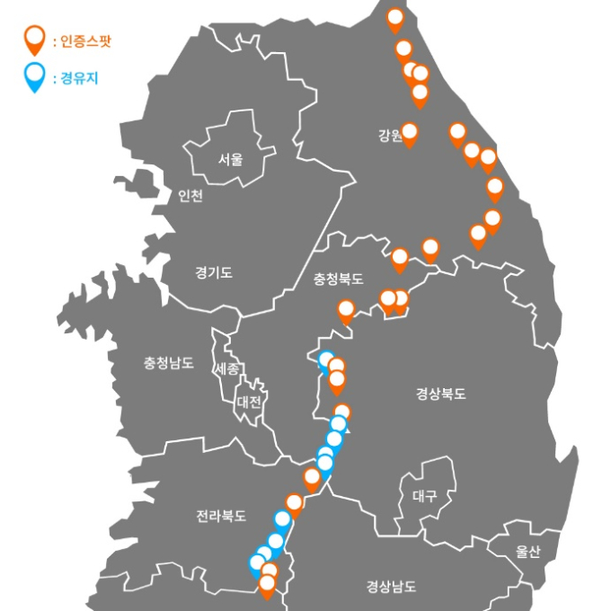 인증 스팟 24곳 외에도 경유지 9곳이 있다. 경유지는 내비게이션을 활용해 인증 스팟에 도전할 경우 백두대간에서 최대한 벗어나지 않으면서 멋진 경관을 감상할 수 있는 경로로 유도하기 위해 선정했다. 단 32번 정령치 휴게소는 3월 31일까지 도로 통제 기간으로 통제가 풀린 후 도전이 가능하다.