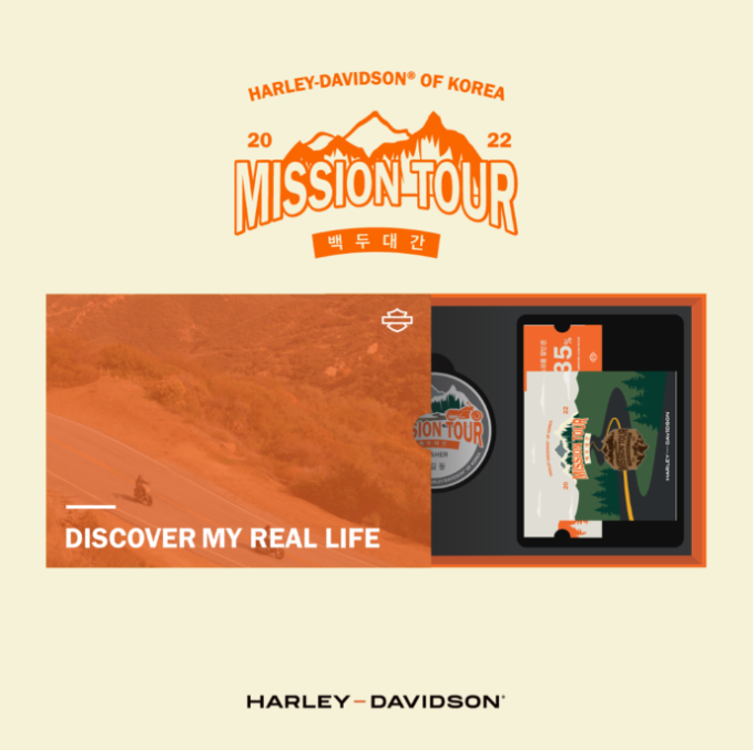 할리데이비슨은 코로나19 이후 참가자들이 개별적으로 참가할 수 있는 ‘미션투어’를 진행해왔다. 올해는 참가자 본인이 인증장소에 도착해 인증샷을 촬영한 후 카카오톡 채널에 올리는 등 행사의 형태를 바꿨다. 사진 촬영 시에는 배경, 모터사이클, 참가자의 얼굴을 식별할 수 있도록 선명하게 촬영해야 하며 모터사이클은 일부만 노출해도 인정한다.