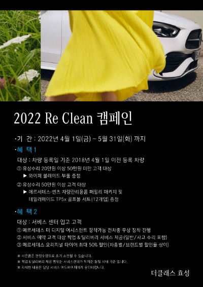 [오토캐스트=강명길 기자] 메르세데스-벤츠 공식 딜러 더클래스 효성이 봄맞이 ‘2022 Re Clean’ 캠페인을 실시한다고 6일 밝혔다. 이번 캠페인은 더클래스 효성이 운영하는 전국 12개 공식 메르세데스-벤츠 서비스 센터에서 내달 31일까지 진행한다.