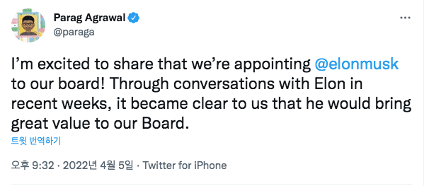 이후 파라그 아그라왈 트위터 CEO는 "최근 몇 주 동안 일론 머스크와 대화를 했다"라며 "트위터의 열정적인 신봉자이자 열렬한 비평가인 일론 머스크의 합류가 장기적인 경쟁력을 높이는 데 도움이 될 것이라고 믿는다"고 환영의 트윗을 남겼다. 이에 일론 머스크는 "앞으로 몇 달 안에 트위터를 크게 개선하기 위해 아그라왈 CEO 및 이사회와 협력하기를 고대하고 있다"고 밝혔다.