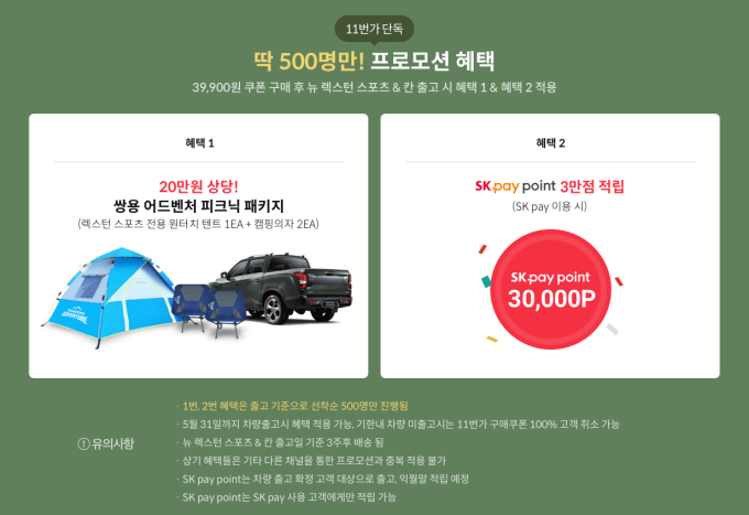 뉴 렉스턴 스포츠&칸의 구매를 원하는 고객은 오는 11일부터 29일까지 11번가에서 20만원 상당의 원터치 텐트와 캠핑의자(2개)로 구성된 쌍용 어드벤처 피크닉 패키지 구매권을 3만9900원에 구매해 신차 계약 시 사용할 수 있다.