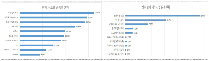 제작사별로는 현대차의 전기차가 전체의 44.2%로 가장 높았으며 기아가 24.3%, 테슬라가 13.8%로 각각 2위와 3위를 차지했다. 또한 2022년 3월 기준 누적등록 상위 전기차 모델은 코나 일렉트릭이 3만2548대로 가장 많았으며 아이오닉5 2만9292대, 포터II 2만8503대, 테슬라 모델3 2만4143대, 니로EV가 1만9783대 순으로 나타났다.