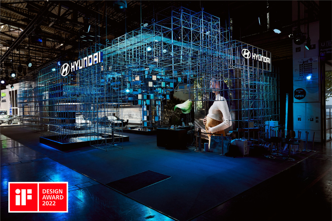 독일 뮌헨에서 열린 IAA 모빌리티 2021 현대차 전시관은 공사장에서 가설물로 사용되는 스캐폴딩을 대여해 제작함으로써 탄소 발생을 줄이고, 수소의 전체 가치사슬을 예술적으로 표현한 ‘수소사회 조형물’ 등을 전시해 디자인 우수성을 인정받았다.