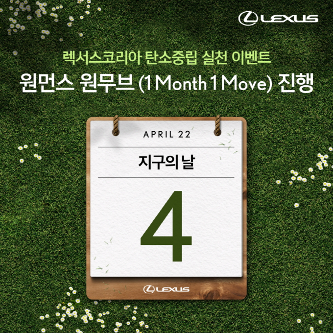 [오토캐스트=강명길 기자] 렉서스코리아가 4월부터 10월까지 매월 환경 기념일마다 ‘원먼스 원무브(1 Month 1 Move)’ SNS 이벤트를 실시한다고 22일 밝혔다. 원먼스 원무브는 탄소중립과 환경보호 실천을 인증하는 이벤트다.