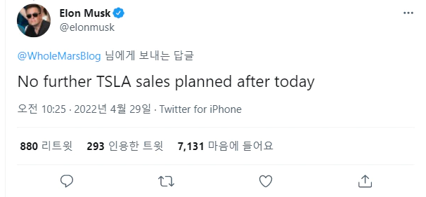 IT 전문매체 테크크런치에 따르면 일론 머스크는 미국 증권거래위원회에 서류를 제출하고 테슬라 주식 약 440만 주를 매각했다. 매각은 지난 26일에서 27일 중 이뤄진 것으로 알려졌다. 구체적인 매각 사유는 공개되지 않았다. 이후 29일 일론 머스크는 자신의 트위터를 통해 "오늘 이후 테슬라 주식을 매각할 계획은 없다"고 밝혔다.