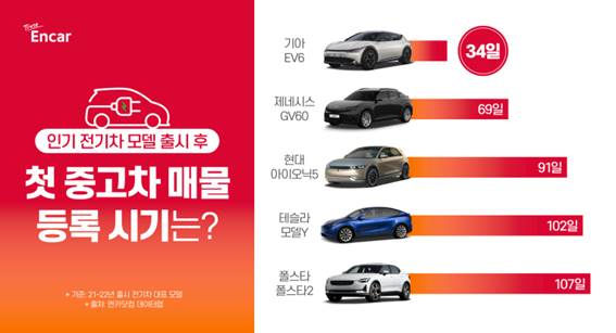 내연기관차는 출시 이후 평균 약 한 달 이내 중고 매물이 올라오나, 전기차는 중고차 시장으로 나오기까지 더 오랜 기간이 필요한 것으로 보인다. 엔카닷컴은 의무운행기간에 따른 전기차 보조금 환수 규정이 지역 마다 다르기 때문에 중고차 거래가 상대적으로 까다로운 이유가 크다고 설명했다. 또 전기차가 내연기관차보다 반도체 수급 이슈의 영향을 더 많이 받고 있어 신차 대기가 길어진 이유도 있는 것으로 해석했다.