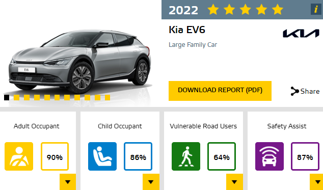 유로 NCAP측은 EV6가 정면 충돌테스트에서 승객 공간이 안정된 상태를 유지하며 탑승객의 무릎과 대퇴골을 잘 보호했다고 평가했다. 또 측면 장애물 테스트에서도 탑승객의 주요 신체를 잘 보호했으며, 프론트 시트 및 헤드레스트 테스트에서도 후방 추돌 시 양호한 신체 보호기능을 확인했다고 밝혔다.
