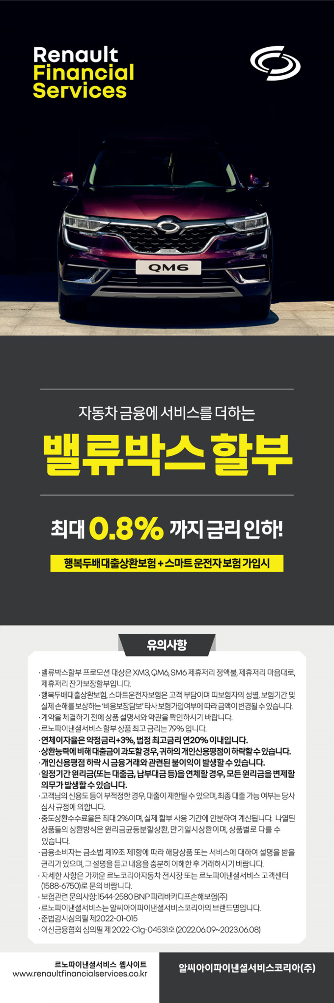 르노파이낸셜서비스코리아 관계자는 “시중 금리가 지속적으로 인상되고 있는 상황 속에서도 르노코리아자동차 고객을 위해 초저금리 할부 상품을 마련해 고객 혜택을 강화했다"며 "여기에 운전 중 발생할 수 있는 다양한 상황에 대비한 보험상품들과 결합한 밸류박스 프로모션을 통해 XM3, SM6, QM6 고객들은 초저금리 혜택과 다양한 운전자 보상 혜택을 동시에 누릴 수 있을 것”이라고 밝혔다.