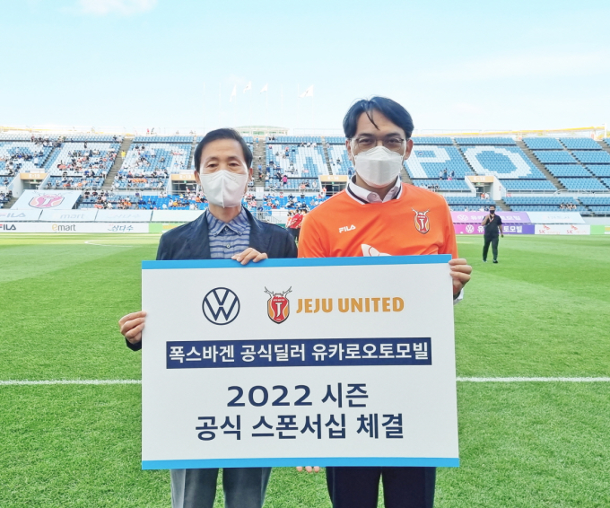 유카로오토모빌과 제주유나이티드는 지난 18일 오후 6시 제주월드컵경기장에서 열린 인천 유나이티드와의 하나원큐 K리그1 2022 16라운드 홈 경기에서 스포츠 마케팅 파트너쉽 체결을 위한 협약식을 진행했다. 이날 협약식에는 유카로오토모빌 폭스바겐 세일즈 김주택 본부장과 제주유나이티드 한중길 대표이사가 참석했다.