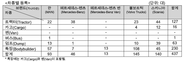 볼보트럭은 특장에서 108대를 기록하며 가장 많은 숫자를 기록했고 만(MAN) 역시 57대로 스카니아의 45대에 비해 많았다. 트랙터에서는 스카니아가 44대로 가장 많았고 메르세데스-벤츠가 38대, 볼보트럭이 23대, 만(MAN)이 23대로 나타났다.