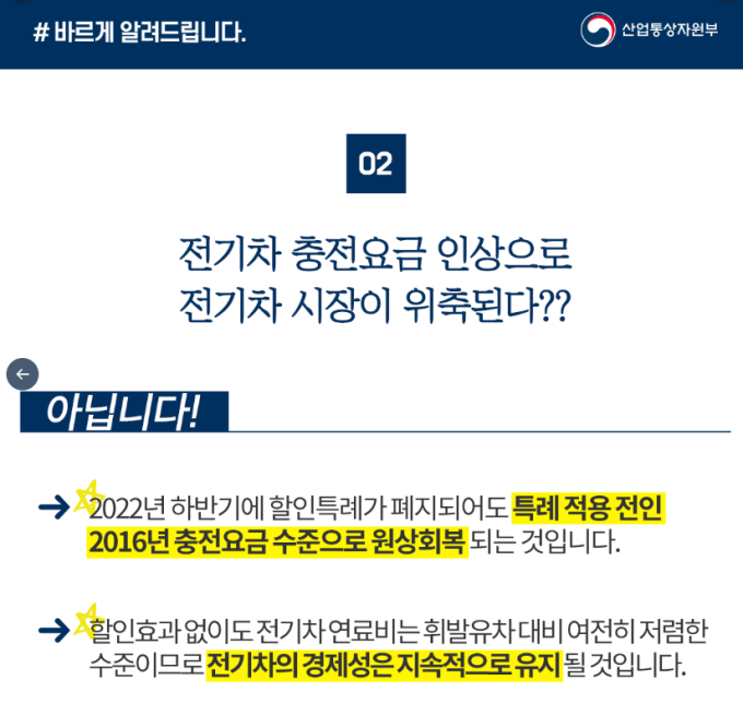 한편 이번 요금 인상으로 전기차 시장 위축으로 이어지는 것이 아니냐는 우려가 이어지고 있다. 문재인 정부 시절이던 지난 2020년 산업통상자원부는 '바르게 알려드립니다'를 통해 "2022년 하반기에 할인특례가 폐지된다 하더라도 특례 적용 전인 2016년 충전요금 수준으로 원상회복 되는 것"이라며 "할인효과 없이도 전기차 연료비는 휘발유차 대비 여전히 저렴한 수준"이라고 밝힌 바 있다.