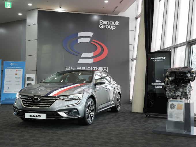 르노코리아차는 이날 행사에서 프랑스를 상징하는 블루, 화이트, 레드의 삼색 라인을 차량 후드에 가미한 특별한 SM6 TCe 300 모델을 ‘SM6 motorized by Alpine (알핀 엔진이 탑재된 SM6)‘라는 주제로 전시했다.