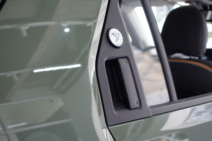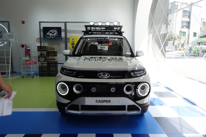입구에 위치한 하얀색 캐스퍼는 전면 상단의 턴 시그널 램프에는 굵은 검은색 라인을 더해 강렬함을 강조했으며 측면으로 다크블루 라인을 길게 이어 젊음을 형상화했다. 맞은 편에는 오렌지 색상을 적용하고 그린 라인을 측면에 그려 넣은 또 다른 캐스퍼가 있다. 현대차 관계자는 "두 차량 모두 랠리하는 모습을 이미지화 했다"며 "이에 전시장 역시 테니스 코트를 연상시키도록 연출했다"고 설명했다.