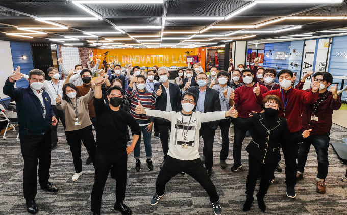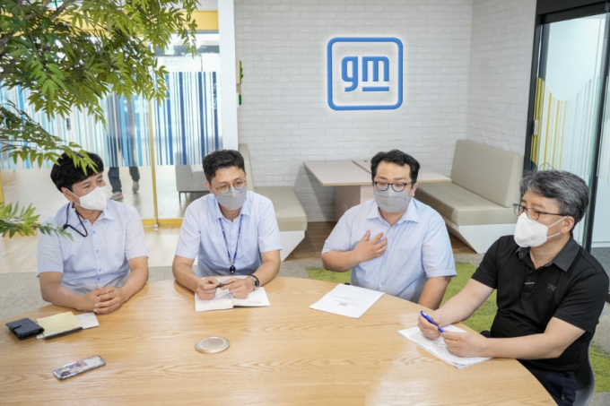 앞서 이야기한 것처럼 이곳에는 여러 부서가 몽땅 들어있다. 이번에 만나는 곳은 지엠테크니컬센터코리아의 엔지니어링센터. 그중에 이노베이션센터다. 올 초 실내를 마치 판교 어디쯤 있는 IT 기업처럼 꾸몄다고 한다. 흰색과 베이지의 벽 그리고 네모난 타일로 된 바닥 대신 카펫을 깔고 투명 유리 칸막이를 세웠다. 벽에는 채도가 높은 보라색, 노란색을 칠했고 라운지는 편안한 소파로 채웠다. 자동차 회사에서는 볼 수 없는 인테리어다.