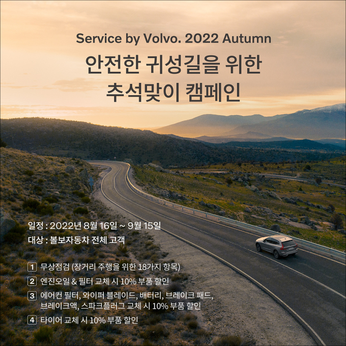 기간 중 전국 32개 볼보자동차 공식 서비스 서비스센터를 방문한 고객은 전문적인 교육을 이수한 테크니션이 진행하는 냉각수·워셔액 무상 보충 포함, 브레이크 패드·디스크 등 제동 계통과 엔진오일 및 필터, 타이밍 벨트, 미션 오일 등 구동 계통까지 장거리 주행을 위한 총 18가지 항목을 무상으로 점검 받을 수 있다.